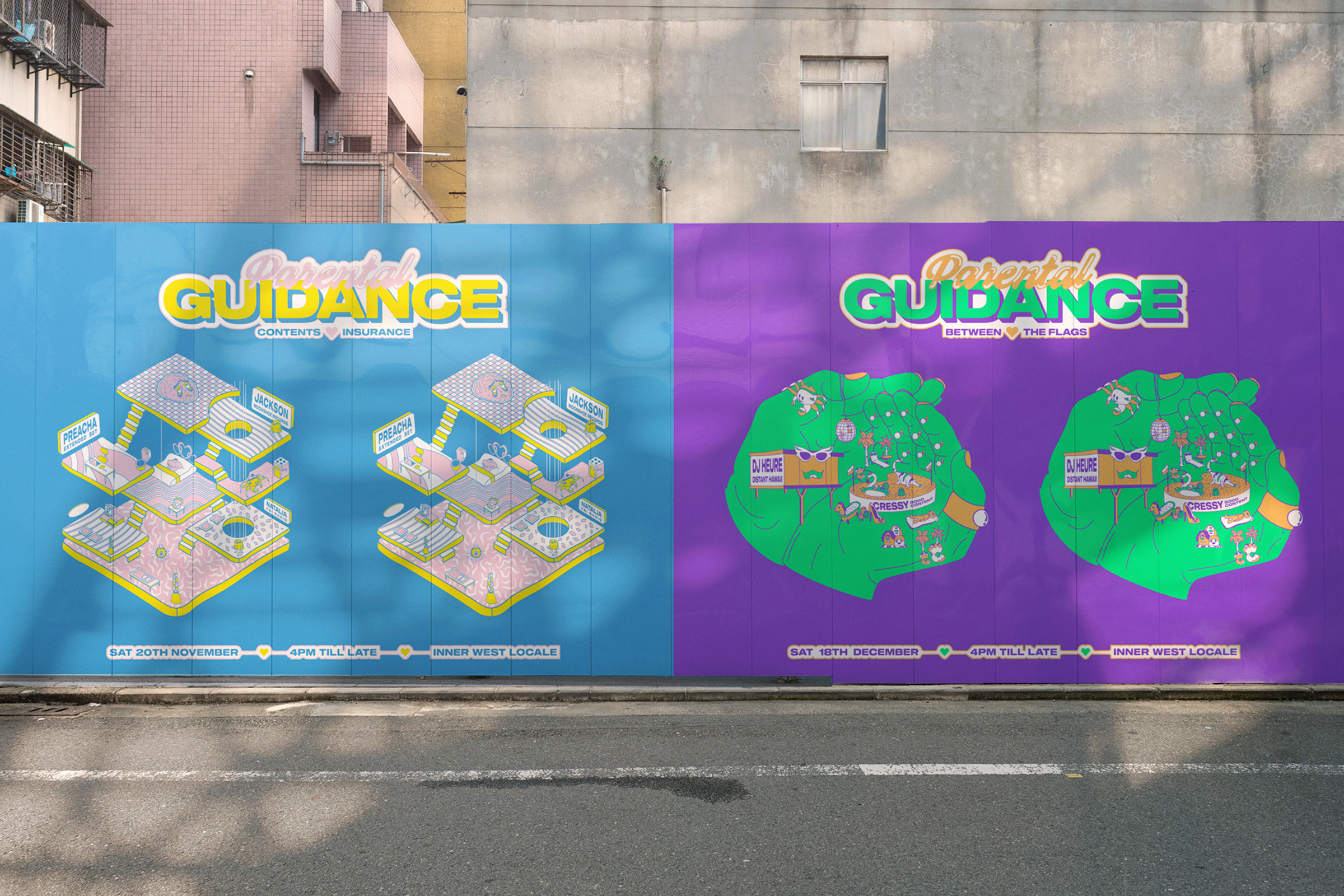Parental Guidance is a Sydney based booking group who run a variety of local music and dance events. With a focus on on upbeat, jazzy house and disco music, Parental Guidance events create a light hearted, exciting and playful atmosphere that all audiences can enjoy. The visual identity of Parental Guidance reflects this playful and inclusive atmosphere, with the use of bold colour combinations, contrasting typefaces and bizarre isometric illustrations.